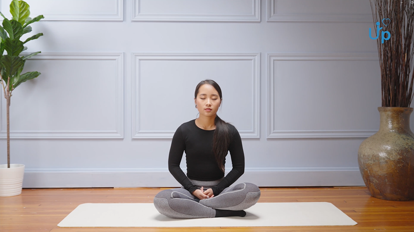 - Sit comfortably upright on a chair or the floor with a mat.